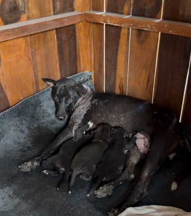 A young mother rescued with a severe infected neck wound, Alma is now safe and reunited with her puppies in our care.